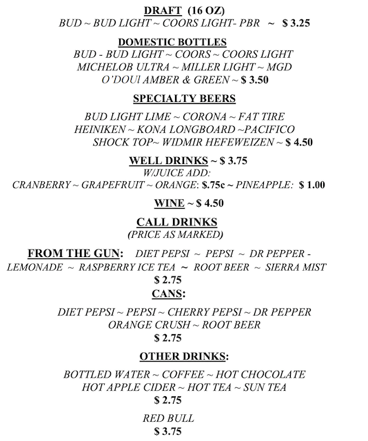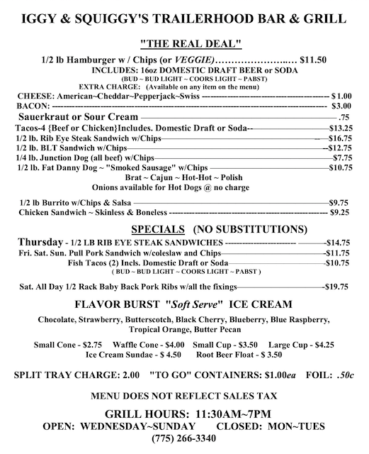 Burgers, hot dogs, steak sandwiches, tacos and more. Full bar and beer. Located north of Hwy 208 off 395 at Holbrook Junction.
