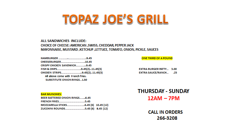 Facebook: https://www.facebook.com/Topaz-Joes-1688661778062046/